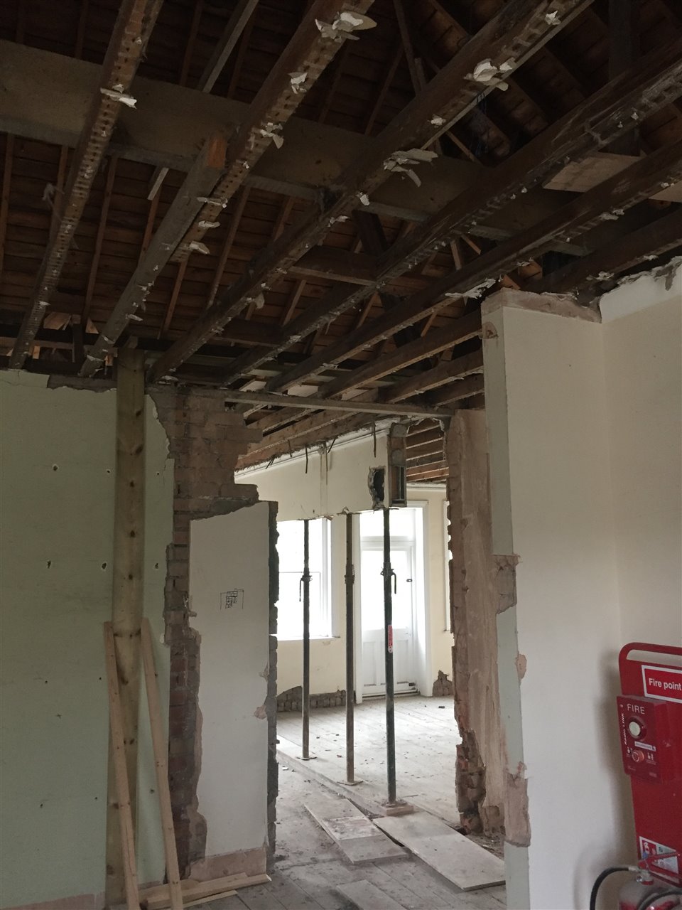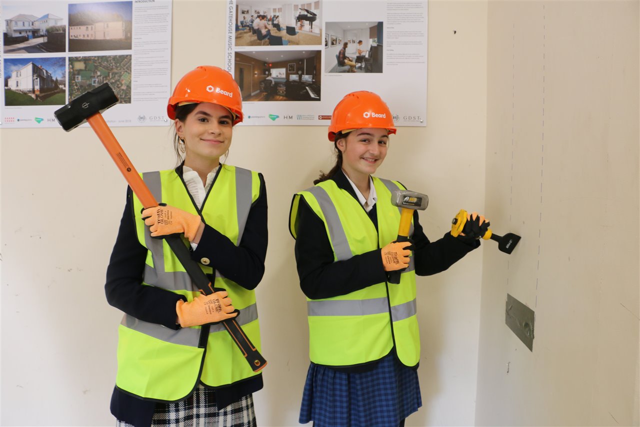 As the project is a renovation rather than a new build there was of course no ground to ‘break’ as such, however Jemima Lawrie, Year 7, and Ursula Perry, Year 13, did a fantastic job of setting to an unwanted stud wall armed with a hammer, axe and chisel to officially mark the start of the works. The girls made the most of a rare opportunity to destroy school property with the School’s blessing!