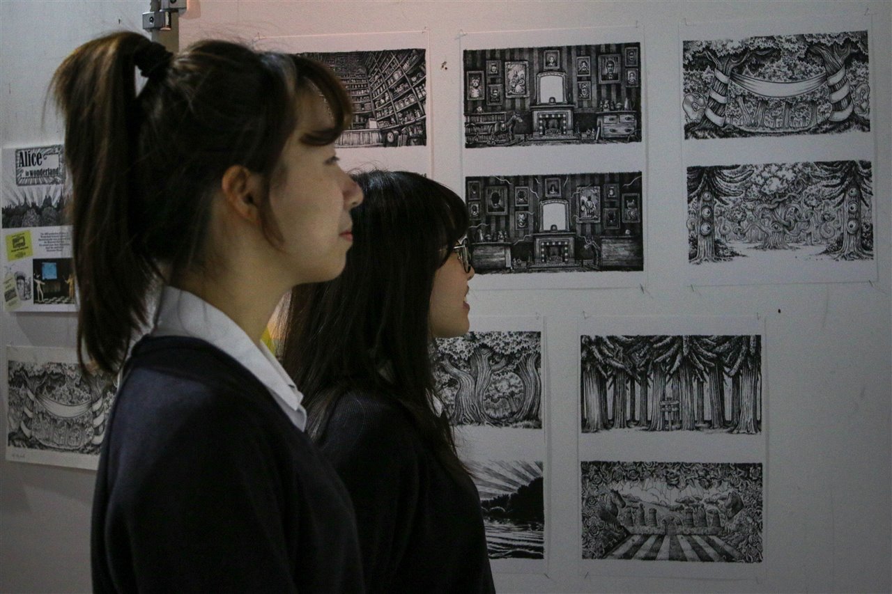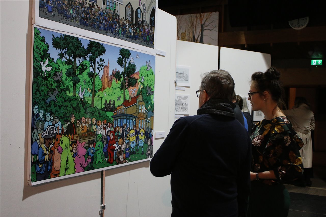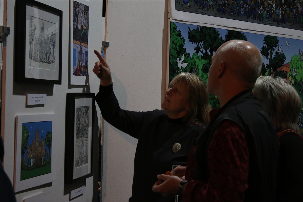 On the Friday morning Year 6 were the first to see the exhibition when Graeme Preedy, Director of Art and Aesthetics, and Perry Harris took the girls on a short tour of the exhibition following their weekly Friday PE lesson at the Senior School. Such was the girls’ interest in the work on display that this did everything to endorse the wide appeal of Perry’s artwork. Clearly impressed by the wide variety of sketches, watercolours and vibrant cartoons the girls were keen to know all sorts of details such as how long it takes Perry to complete a piece of his artwork, which is his favourite and in the more detailed pictures how he knows where to put the different elements.
